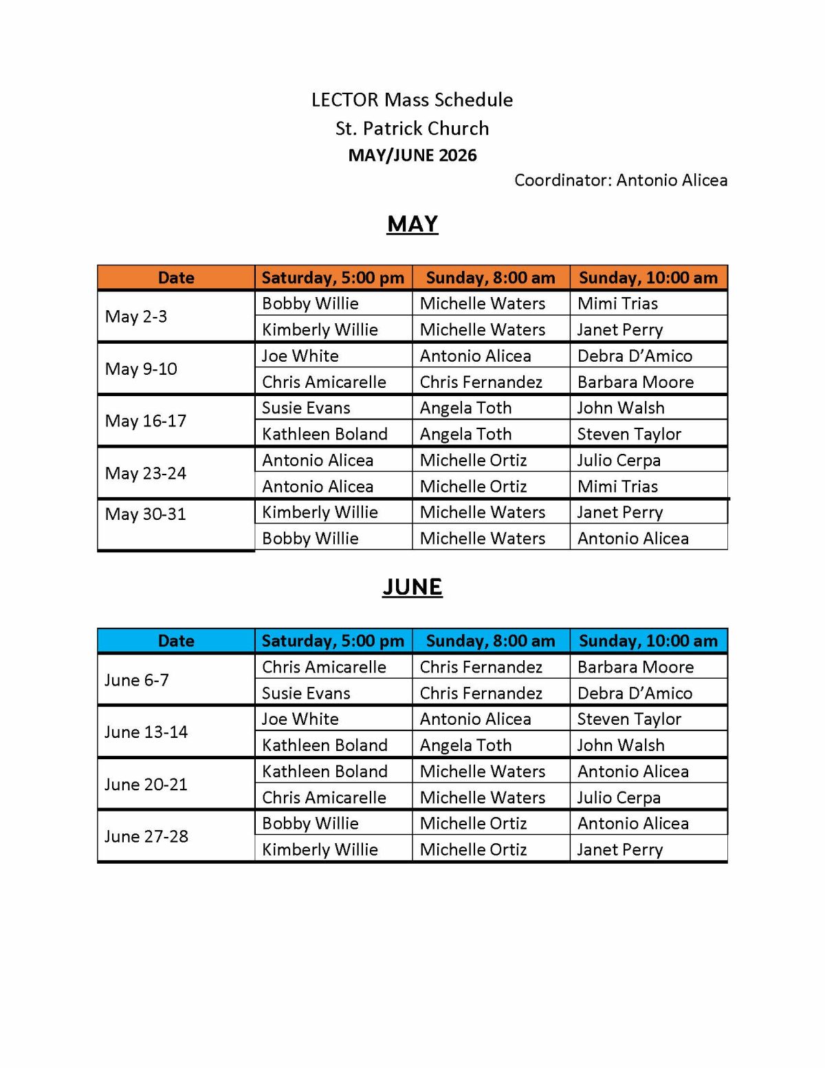 Lectors If you would like to become a Lector to help proclaim the word during mass, please contact: Antonio Alicea – stpatslectors157@gmail.com